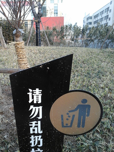滿布園區(qū)公舍的“請勿亂扔垃圾”警示金屬提示牌邊角鋒利,原為溫馨提示,卻成了兒童玩耍時的安全隱患。