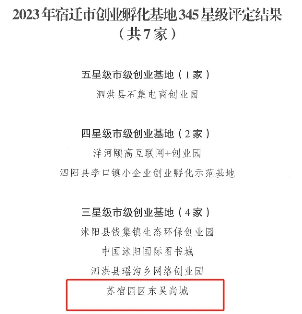 近日,2023年宿遷市創(chuàng)業(yè)孵化基地345星級評定結(jié)果發(fā)布,宿遷市蘇宿園區(qū)建設(shè)發(fā)展有限公司服務(wù)項(xiàng)目園區(qū)公舍東吳尚城創(chuàng)業(yè)孵化基地榮獲2023年宿遷市創(chuàng)業(yè)孵化基地三星級稱號。