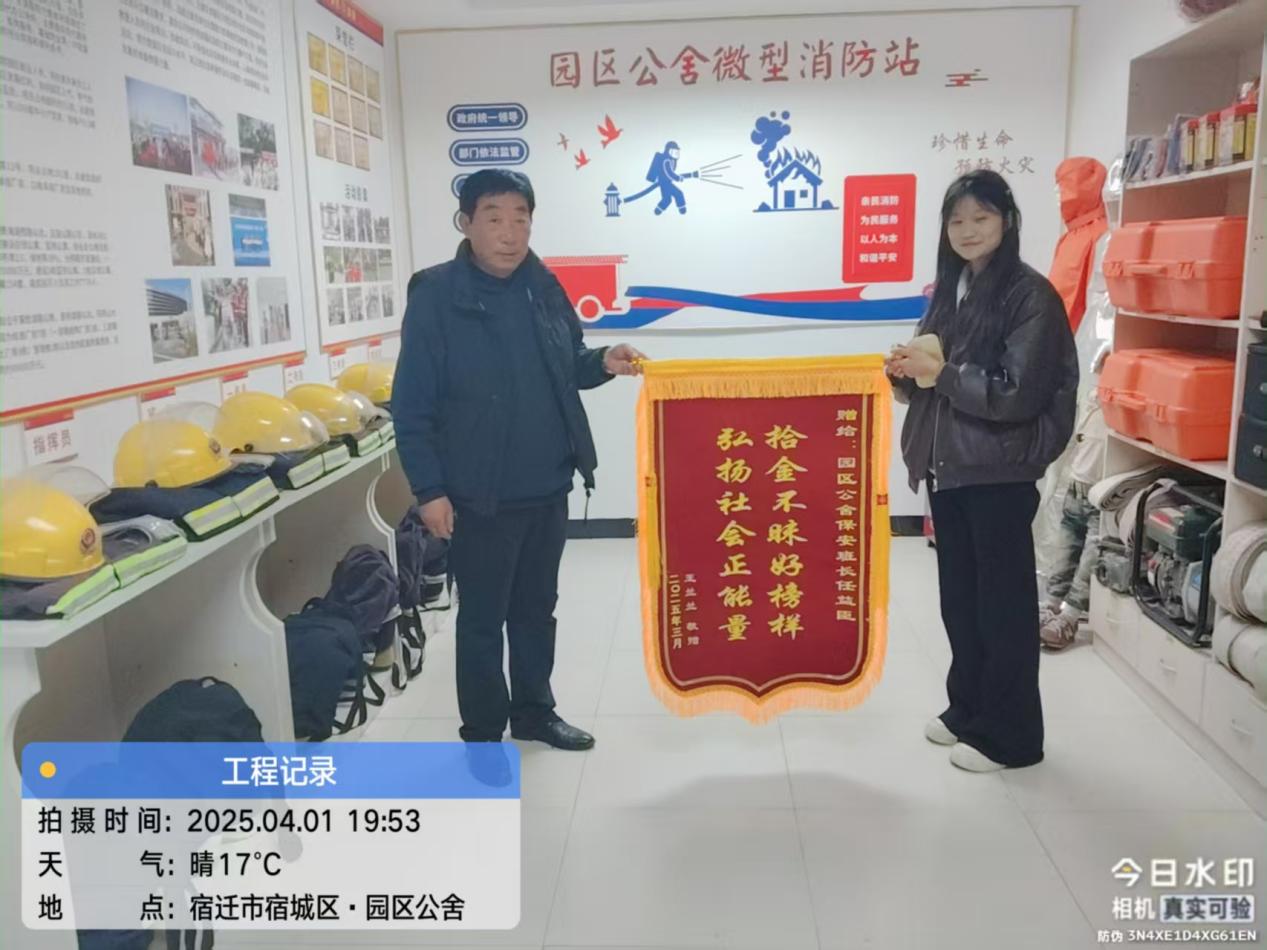 4月1日晚,園區(qū)公舍住宿員工為保安班長任益臣送來一面錦旗,對他的拾金不昧表示感謝。