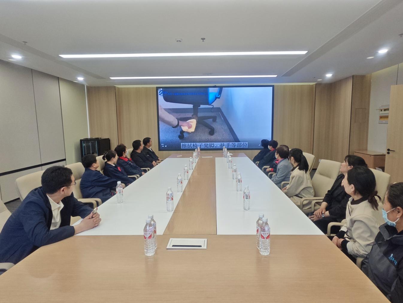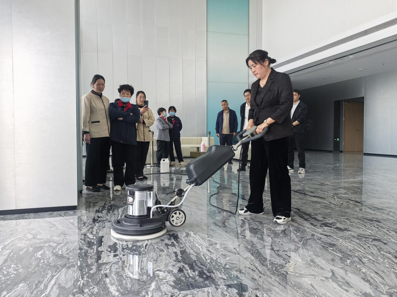 培訓(xùn)圍繞辦公大樓地面清掃、電梯轎廂清潔保養(yǎng)、玻璃幕墻清洗維護(hù)、會(huì)議室、茶水間及衛(wèi)生間細(xì)節(jié)處理到外圍路面和綠化區(qū)域的日常清理管養(yǎng)等內(nèi)容,通過(guò)觀看視頻和現(xiàn)場(chǎng)演示方式,詳細(xì)講解了操作規(guī)范和作業(yè)標(biāo)準(zhǔn),確保保潔人員能夠熟練掌握高效、科學(xué)的清潔技巧,提高工作質(zhì)量與效率。