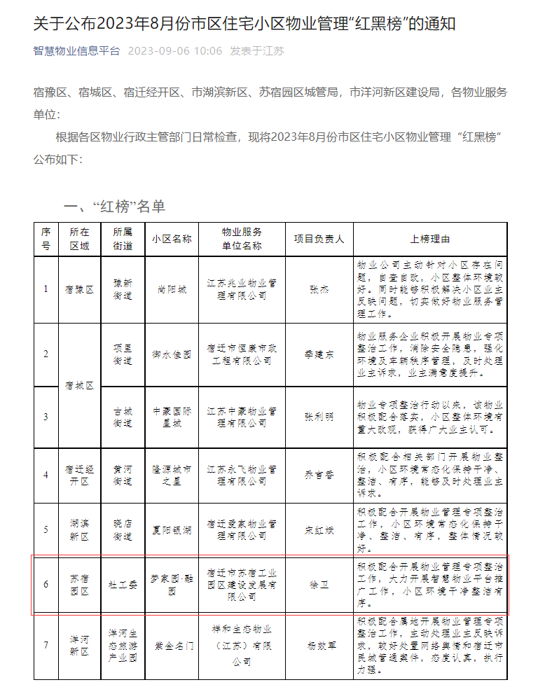 物業(yè)服務(wù)好不好,“紅黑榜”上見分曉。829日,宿遷市住房和城鄉(xiāng)建設(shè)局公布8月份市區(qū)住宅小區(qū)物業(yè)管理“紅黑榜”?,建發(fā)公司夢家園項目物業(yè)服務(wù)質(zhì)量綜合考評“優(yōu)秀”,榮登“紅榜”。