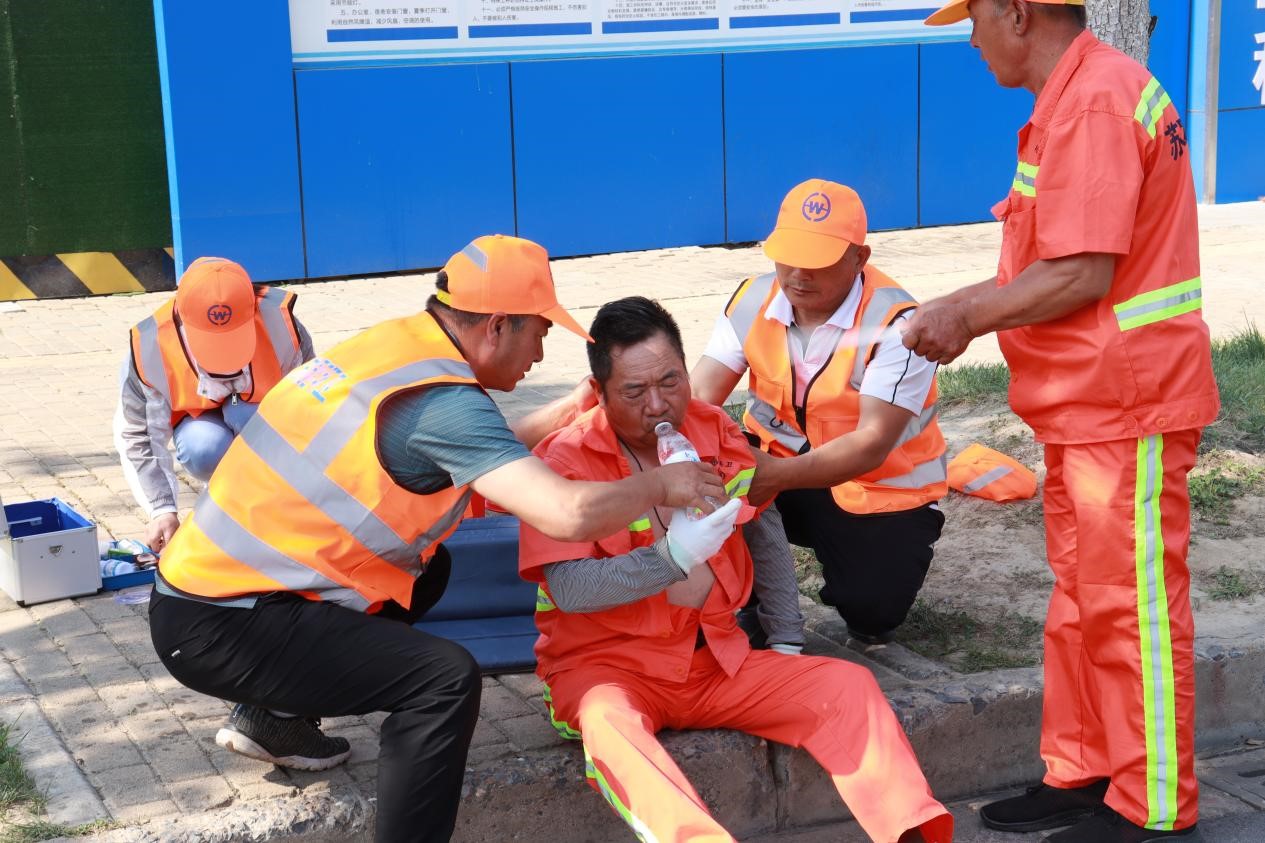 此次演練模擬一名環(huán)衛(wèi)工人在作業(yè)過程中,突然感到頭暈、心慌乏力,立即向主管人員電話求助。主管人員隨即趕到現(xiàn)場查看情況,發(fā)現(xiàn)環(huán)衛(wèi)工人躺坐在現(xiàn)場,面色潮紅、大汗淋漓,精神狀況不佳,系中暑跡象,立即向項(xiàng)目經(jīng)理報告,聯(lián)系應(yīng)急救援人員,并呼喊附近作業(yè)人員將其攙扶到陰涼處,解開衣扣散熱,應(yīng)急救援人員趕到現(xiàn)場后,立即用濕毛巾、酒精棉擦拭身體,涂上清涼油,喂服藿香正氣水、淡鹽水......,經(jīng)過初步救護(hù),中暑人員癥狀得以緩解后,隨即將其送往園區(qū)社區(qū)衛(wèi)生服務(wù)中心進(jìn)一步治療。