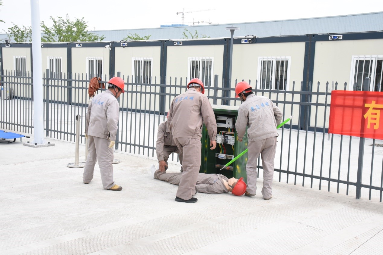 本次演練主要目的是熟悉人身觸電事故處理的流程,演練的重點突出在人身觸電后要及時斷開電源避免造成二次傷害和及時進(jìn)行現(xiàn)場急救等措施。演練以路燈維修人員在進(jìn)行配電柜內(nèi)部清潔時誤碰帶電部位發(fā)生人身觸電為主線,貫穿了從事故發(fā)生、現(xiàn)場救援、事故恢復(fù)、到預(yù)案關(guān)閉全過程。事故發(fā)生后,應(yīng)急指揮小組立即發(fā)布應(yīng)急預(yù)案啟動信號,并與就近醫(yī)療服務(wù)單位聯(lián)系,派人外出接應(yīng)急救車輛;同時現(xiàn)場救援組迅速切斷配電柜電源,將觸電人員轉(zhuǎn)運至安全處進(jìn)行搶救;警戒組立即疏散無關(guān)人員,設(shè)置警戒線,維持現(xiàn)場秩序。參演人員密切配合,相互協(xié)助,嚴(yán)格按照演練要求和現(xiàn)場指揮命令有條不紊開展救援行動,圓滿完成了此次演練任務(wù)。